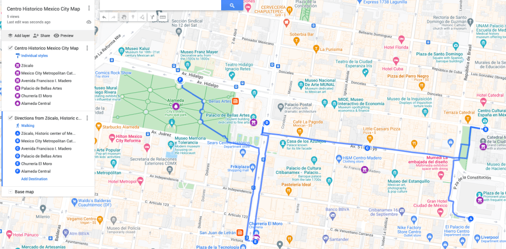 Here is a glimpse of google map of places to visit Mexico City on your first day. Staring from point A to point F in map below, if you just walk ,you can over all these sites in less than 30 minutes. Everything is literally right next to each other.